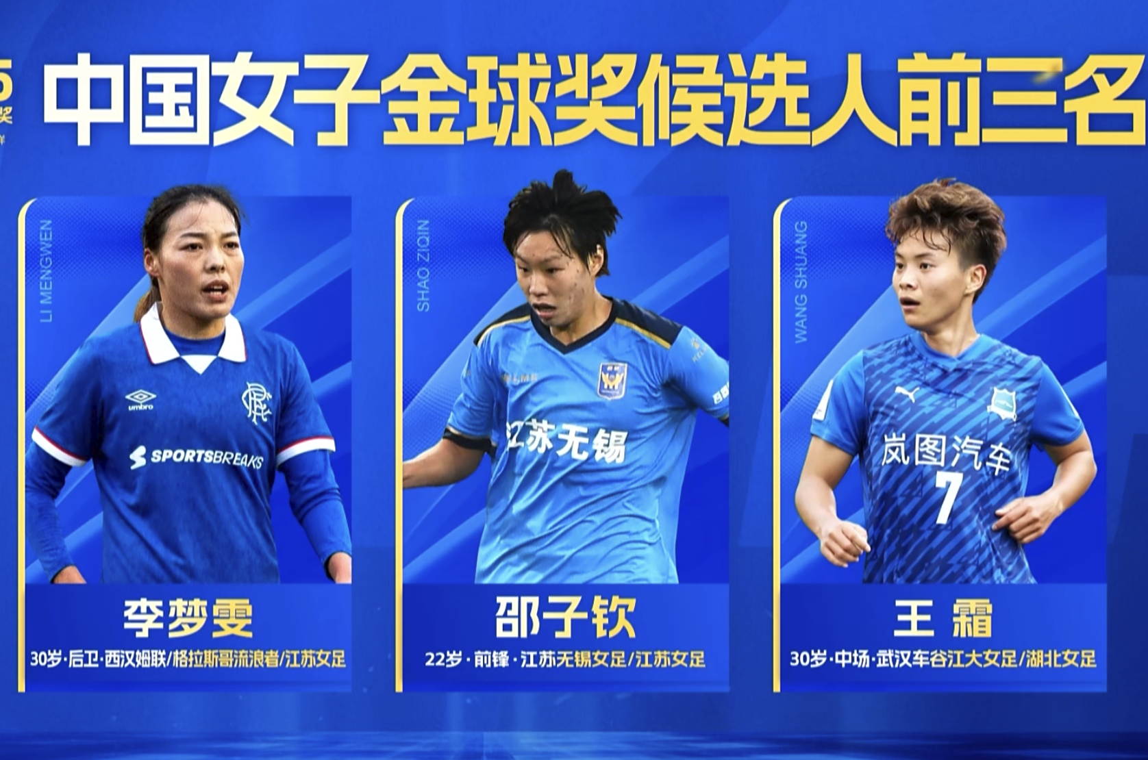 王霜则力压李梦雯以及邵子钦,成功夺得年度女子金球奖,个人第5次赢得该荣誉。王霜在去年带领武汉车谷江大女足登上亚冠之巅,王霜在亚冠半决赛以及决赛中都有关键进球。王霜也帮助湖北队打进全运会决赛,王霜获奖实至名归。目前王霜在澳大利亚跟随中国女足备战亚洲杯,没能到场领奖。
